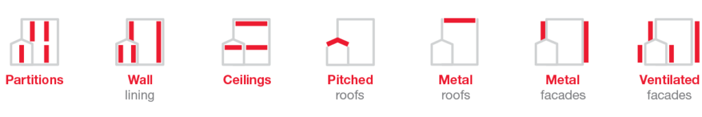 Volcalis glaswol is geschikt voor gebruik in bouw- en renovatiewerkzaamheden, zoals scheidingswanden, plafonds, interne wandbekleding, dakbedekking en gevels.