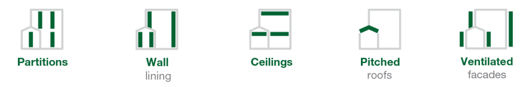 - Toepassing: Scheidingswanden, Wandbekleding, Schuine daken, Geventileerde gevels, Plafonds