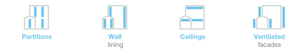 Geschikt voor gebruik in bouw- en renovatiewerkzaamheden, zoals: scheidingswanden, plafonds, binnenwandbekleding en geventileerde gevels.